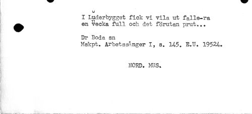 //// I Luderbygget fick vi vila ut falle-ra //// ^^ en vecka full och det förutan prut... //// Dr Boda sn //// Mskpt. Arbetssånger I, s. 145. E.U. 19524. //// HORD. MUS. //// i //// P/ ////