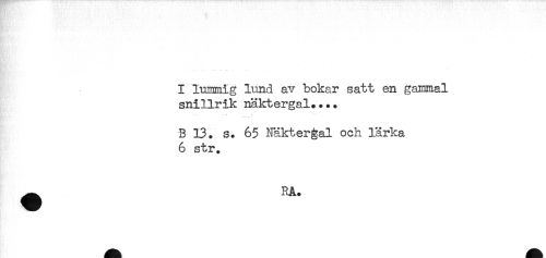 //// I lummig lund av bokar satt en gammal //// snillrik näktergal.... //// B 13. s. 65 Näktergal och lärka //// 6 str. //// ^ RA. ////