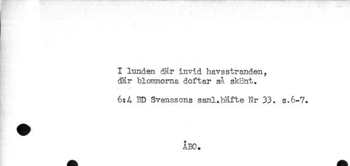//// I lunden där invid havsstranden, //// där blommorna doftar så skönt. //// ** . .. //// 6:4 BD Svenssons saml.häfte Nr 33. s.6-7. //// 'Hy ////