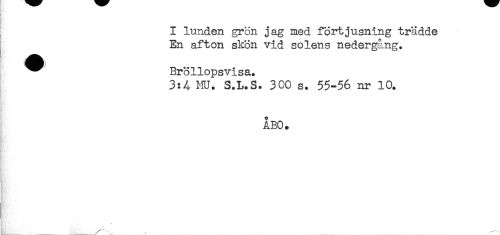 //// I lunden grön jag med förtjusning trädde //// En afton skön vid solens nedergång. //// ^^ Bröllops vi sa. //// 3:4 MU. S.L.S. 300 s. 55-56 nr 10. //// ÅBO. //// ...... ////