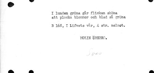 //// I lunden gröna går flickan sköna //// att plocka blommor och blad så gröna //// B 168, I Lifvets vår, A str. melnot. //// < //// MOLIN ÖREBRO. //// i ////
