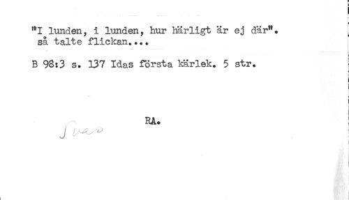 //// lunden, i lunden, hur härligt är ej där". . //// så talte flickan.... //// B 98:3 s. 137 Idas första kärlek. 5 str. j //// r //// i //// i //// ! //// RA. //// J //// i //// ) ////