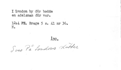//// i //// i //// I Lundoia by där bodde ' //// en adelsman där var. i //// **' t" //// 12:4 PE. Brage 5 s. Al nr 36. //// N. //// ÅBO. //// * ////