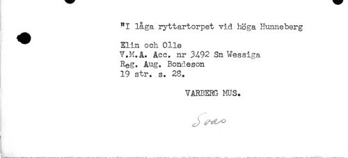 //// "I låga ryttartorpet vig höga Hunneberg //// ^^ Elin och Olle //// V.M.Å. Åcc. nr 3492 Sn W-essiga //// Reg. Aug. Bondeson //// 19 str. s. 28. //// ! VARBERG MUS. //// t //// ; ////