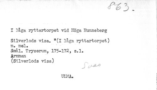 //// I låga ryttartorpet vid Höga Hunneberg //// Silverlods visa. "(i låga ryttartorpet) //// mel. //// Smål. Tryserum, 175-172, s.l. //// Ärnman //// (Silverlods visa) //// J //// umA. : //// } //// t //// - //// * ////