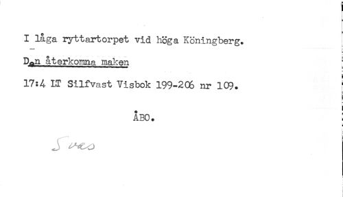 //// I låga ryttartorpet vid höga Köningberg. //// L- //// D^n återkomna maken ' //// c //// 17:A LT Silfvast Visbok 199-206 nr 10?. ! //// t //// i= //// ÅBO. ! //// i //// t- //// L ////