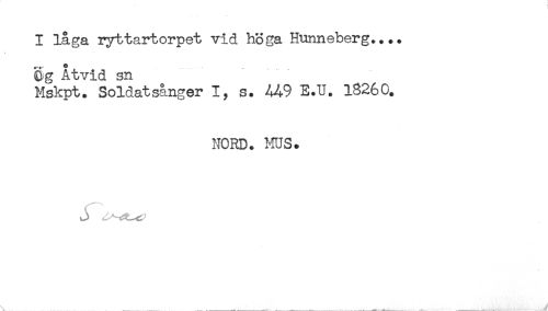 //// I låga ryttartorpet vid höga Hunneberg.... //// Cg Åtvid sn //// Mskpt. Soldatsånger I, s. AA9 E.U. 13260. //// NORD. MUS. //// J ////