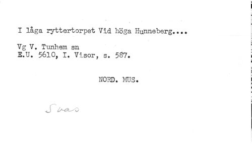 //// ! //// < //// < //// L //// r //// ! //// I låga ryttertorpet Vid höga Hunneberg.... //// - //// Vg V. Tunhem sn //// E.U. 5610, 1. Visor, s. 587. i //// a //// c //// C //// NORD. ms. [ //// H //// * //// t //// J ////