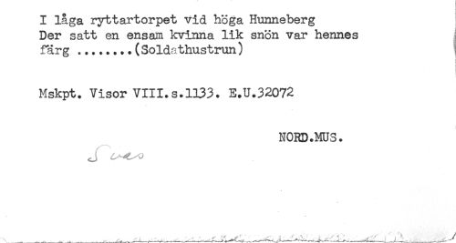 //// I låga ryttartorpet vid höga Hunneberg //// Der satt en ensam kvinna lik snön var hennes //// färg........(Soldathustrun) //// i //// t //// Mskpt. Visor VIII.s.1133. E.U.32072 //// NORD.MUS. ////