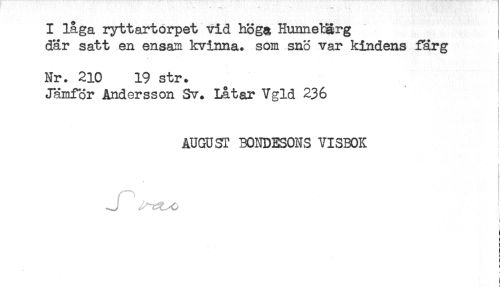 //// I låga ryttartorpet vid höga Hunnetarg //// där satt en ensam kvinna, som snö var kindens färg //// - //// Nr. 210 19 str. //// Jämför Andersson Sv. Låtar Vgld 236 //// AUGUST BONDESONS VISBOK //// ! //// i //// ) //// ! //// i //// < //// i //// < ////