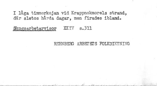 //// I låga timmerkojan vid Krappnokmorels strand, //// där sletos hårda dagar, men firades ibland. //// Skoas arbet arvi sor XX I? s. 311 //// REHNBE3G ARBETETS FOIRDIKTNING ////