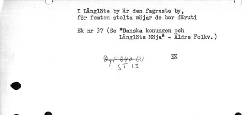 //// I Langlöte by är den fagraste ty, //// for femton stolta möjar de bor däruti //// Ek nr 37 (Se ^Danska konungen och //// Langlöte Möja" - Äldre Folkv.) //// EK ////