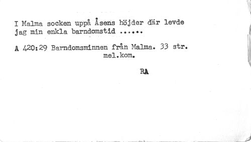 //// -1 //// 1 //// I Malma socken uppa Åsens höjder där levde //// j ag min enkla barndomstid ...... //// A 420:29 Barndomsminnen från Malma. 33 str. //// mel. kom. //// RA //// ......-............ -....... i.—i. ___^-...i-...-........^ ....... . ...... ////