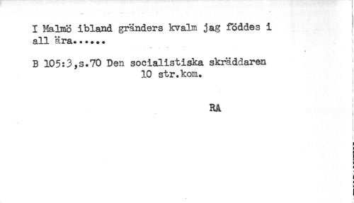 //// I Malmö ibland gränders kvalm jag föddes i //// all ära...... //// * 1 //// B 105:3,s.70 Den socialistiska skräddaren //// 10 str.kom. //// ! //// RA //// i //// ! //// ! //// a //// i //// ! //// L //// t ////