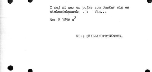 //// I mej ni ser en pojke som önskar sig en //// nickenickenack: . : vän... //// 3 //// Se: E 1896 x //// KB:s SKILLINGT RYCKSRBG. ////