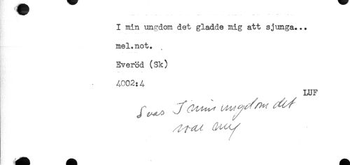//// I min ungdom det gladde mig att sjunga... //// mel.not. //// Everod (Sk) //// 4002:4 //// LUF //// / ////