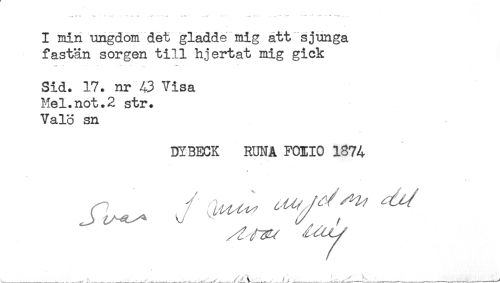 //// I min ungdom det gladde mig att sjunga //// fastän sorgen till hjertat mig gick //// Sid. 17. nr 43 Visa //// Hel.not.2 str. //// Valö sn //// DYBECK RUNA FOIIO 1874 //// ..._____.i-...^--.....^._______. ; --^ ' —Lj-------,-------^ ////