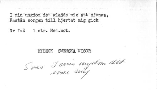 //// I min ungdom det gladde mig att sjunga. //// Fastän sorgen till hjertat mig gick //// % //// Nr 1:2 1 str. Mel.not. //// i //// t //// DYBECK SHENSKA HISOR //// * //// ! //// ! //// ! //// t //// ! ////