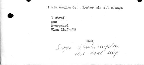 //// I min ungdom det lyster mig att sjunga //// ^ 1 strof //// mus //// Overgaard //// ULna 11642:25 //// * //// UIMA //// ___.______ ... _______ ////