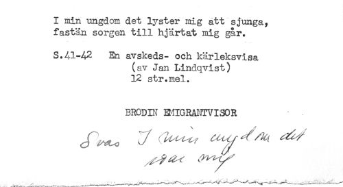 //// I min ungdom det lyster mig att sjunga, //// fastän sorgen till hjärtat mig gar. //// S. 41-42 En avskeds- och kärleksvisa //// (av Jan Lindqvist) //// 12 str.mel. //// BRODIN BIIGRAUTVISOR //// J ^ y ^^ v^ ^ ////