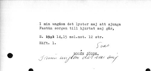 //// I min ungdom det lyster mej att sjunga //// Fastän sorgen till hjärtat mej går, //// S. ijgpi 14? 15 mel.not. 12 str. //// Häft. 1. //// J ^^ //// ^ ROSEN JÖDpE. //// * ^^rv ^^ ////