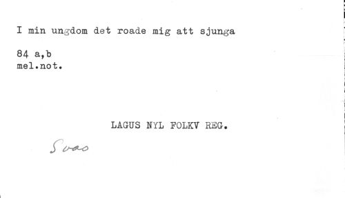 //// i //// 7* //// I min ungdom det roade mig att sjunga //// r //// t //// t* //// : //// 84 a,b //// mel.not. //// T //// ! //// i //// -i //// t //// LAGUS NYL FOLKV REG. //// ! //// t ////