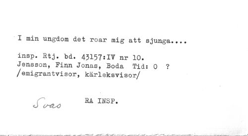 //// I min ungdom det roar mig att sjunga.... //// insp. Rtj. bd. 43157:IV nr 10. //// Jensson, Finn Jonas, Boda Tid: 0 ? //// /emigrantvisor, kärleksvisor/ //// * //// RA INSP. ////