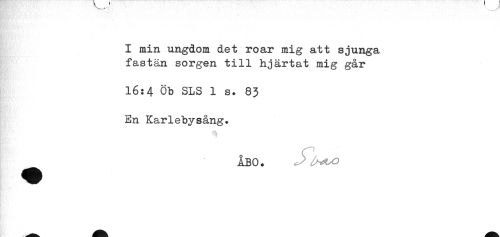 //// I min ungdom det roar mig att sjunga //// fastän sorgen till hjärtat mig går //// 16:4 Öb SLS 1 s. 83 //// En Karlebvsång. //// ^ ÅBO. <^<3 ////