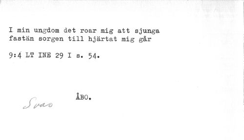 //// I min ungdom det roar mig att sjunga //// fastän sorgen till hjärtat mig går //// 9:4 LT INE 29 I s. 54. //// < //// i //// { //// ÅBO. I ////