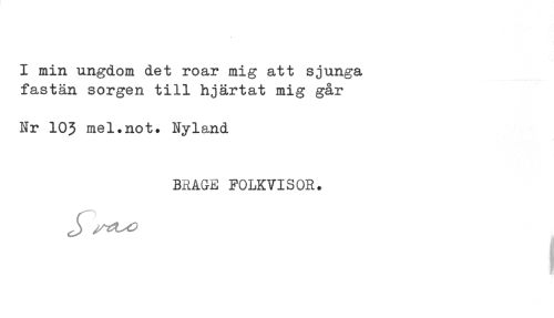 //// I min ungdom det roar mig att sjunga //// fastän sorgen till hjärtat mig går //// Nr 103 mel.not. Nyland //// BRAGE FOLKVISOR. ////