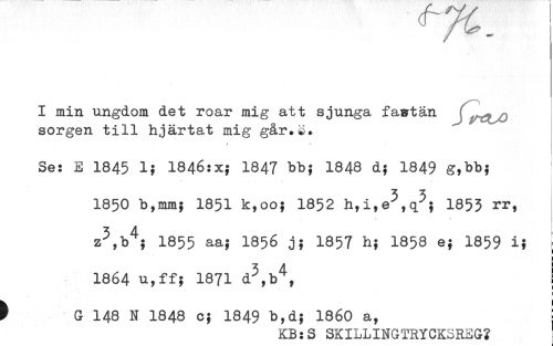 //// I min ungdom det roar mig att sjunga fastän r //// sorgen till hjärtat mig går.a. //// * *? //// i //// Se: E 1845 1} 1846:x; 1847 bb; 1848 d; 1849 g,bb; //// 5 5 //// 1850 b,mm; 1851 k,oo; 1852 1853 rr, //// - / //// 1855 aa; I856 j; 1857 h; 1858 e; 1859 i; ; //// 1864 u,ff; 1871 j //// ^ ji ////