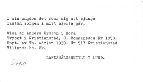 //// ! //// I min ungdom det roar mig att sjunga //// fastän sorgen i mitt hjerta går, //// Wisa af Anders Ersson i Mora //// Tryckt i Kristianstad, C. Bohmansson år 1858. //// Uppt. av Th. Adrian 1930. Nr 517 Kristianstad ' //// Villands hd. Sk. //// LANDSMALSARKIV^T I LUND. //// J ////