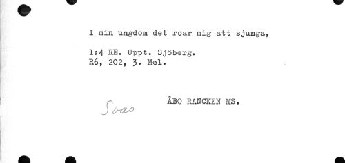 //// I min ungdom det roar mig att sjunga, //// 1:4 RE* Uppt. Sjöberg. //// R6, 202, 3* Mel. //// ÅBO RANCKEN MS. //// J ^^ ////