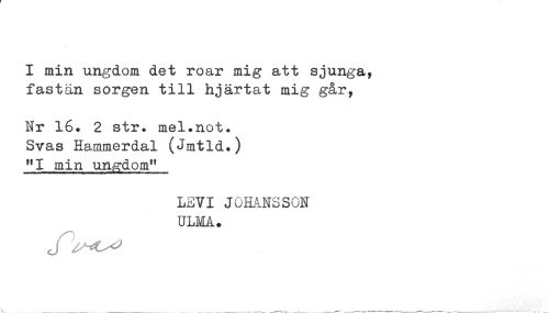 //// I min ungdom det roar mig att sjunga, //// fastän sorgen till hjärtat mig går, //// Nr 16. 2 str. mel.not. //// Svas Hammerdal (Jmtld.) //// "I min ungdom" //// LEVI JOHANSSON //// ULMA. ////