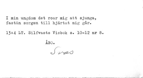 //// I min ungdom det roar mig att sjunga, //// fastån sorgen till hjärtat mig går. //// 13:4 LT. Silfvasts Visbok s. 10-12 nr 8. //// ÅBO. ////