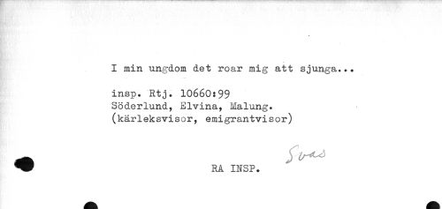 //// I min ungdom det roar mig att sjunga... //// insp. Rtj. 10660:99 //// Söderlund, Elvina, Malung, //// (kärleksvisor, emigrantvisor) //// ^ RA INSP. ////