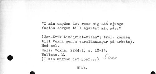//// . //// "I min ungdom det roar mig att sjunga //// fastån sorgen till hjärtat mig går." //// (Jan-Erik Lindqvist-visan"; trol. kommen //// till Voxna genom värmlänningar på arbete). //// Med mel. //// Häls. Voxna, 2244:2, s. 10-15. //// ^^ Wallman, M. //// (i min ungdom det roar...) //// Hr ,, //// ULIåÅ. ////