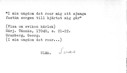 //// (Visa om sviken kärlek) //// Härj. Tännäs, 17040, s. 21-22. //// Granberg, Georg, //// (i min ungdom det roar...) //// ULMA. ^a^ //// L //// ^ //// ! //// ! //// E //// i //// B ////