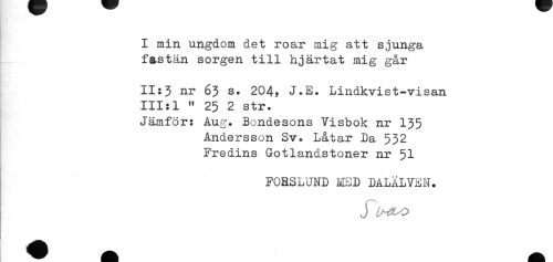 //// * //// 11:3 ni* 63 s. 204, J.E. Lindkvist-visan //// 111:1 " 25 2 str. //// Jämför: Aug. Bondesons Visbok nr I35 //// Andersson Sv. Låtar Da 532 //// Fredins Gotlandstoner nr 51 //// FORSLUND HED DALÄLVEN. //// J ////