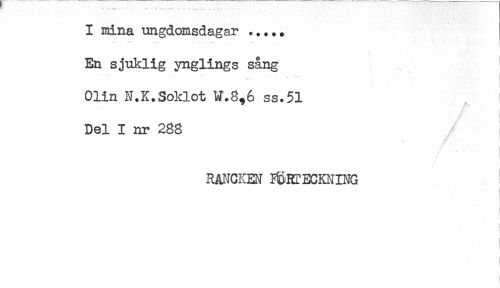//// I mina ungdomsdagar ..... //// En sjuklig ynglings sång //// Olin N.K.Soklot W.8,6 ss.51 ' //// Del I nr 288 j //// ! //// RANCHEN FÖRTECKNING //// i //// ) //// ) //// ! ////