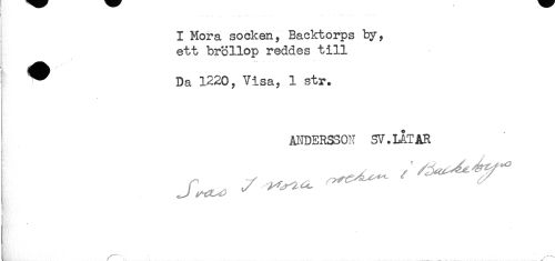 //// I Mora socken. Backtorps by, //// ett bröllop reddes till //// ^ Da 1220y Visa, 1 str. //// ANDERSSON SV.LATAR ////