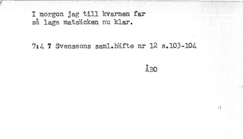 //// I morgon jag till kvarnen far //// så laga matsäcken nu klar. //// 7:4 ? Svenssons saml.häfte nr 12 s.103-104 //// ÅBO //// t) ////