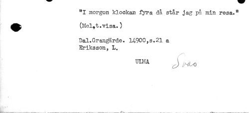 //// "I morgon klockan fyra då står jag på min resa." //// ^^ (Hel,t.visa. ) //// Dal.Gran#rde. 14900,s.21 a //// Eriksson, L. //// / //// L ( ' 1 \ ' ////