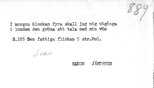 //// I morgon klockan fyra skall jag mig utgånga //// i lunden den gröna att tala med min vän //// S.105 Den fattiga flickan 5 str.Mel. //// J ^X^ } //// SHON JÄMT BYGD //// t //// ! //// ! //// [ //// i //// H //// 5 ////