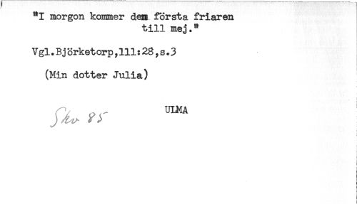 //// "I morgon kommer dem första friaren //// till mej." //// Vgl.Björketorp,111:28,s.3 //// (Min dotter Julia) //// < //// i //// < //// } //// i //// r //// ! //// ! ////