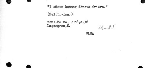 //// ! "I måron kommer första friam." //// (Mel.t. visa. ) //// Vsml.Malma, 7046,s.38 //// Lagergren,E. ^ ^ //// ULMA //// * ////