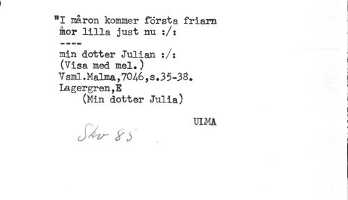 //// **I maron kommer första friam //// mor lilla just nu :/: //// min dotter Julian :/: //// (Visa med mel.) //// Vsml.Malma,7046,s.35-38. //// Lagergren,E //// (Min dotter Julia) //// m,Må ; ////