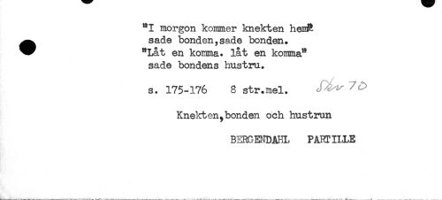 //// **I morgon kommer knekten hen& //// ^^^ sade bonden,sade bonden. //// ^^ "Lat en komma, låt en komma" //// sade bondens hustru. //// s. 175-176 8 str.mel. //// Knekten,bonden och hustrun //// BERGENDAHL PARTILLE ////