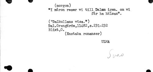 //// (morgon) //// "I måron reser vi till Daliam igen. om vi //// får ha hälsan". //// h //// ("Dalkullans visa.*) //// Dal. Gr an#rde, 11AS2, s. 231-232 //// Blixt,0. //// (Enstaka romanser) //// ULMA //// J ^ //// ! ////