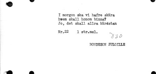 //// I morgon ska vi hafre skära //// h^em skall honom binna? //// Jo, det skall allra käråstan //// Nr.22 l str.mel. //// BONDESON JULGILLE ////